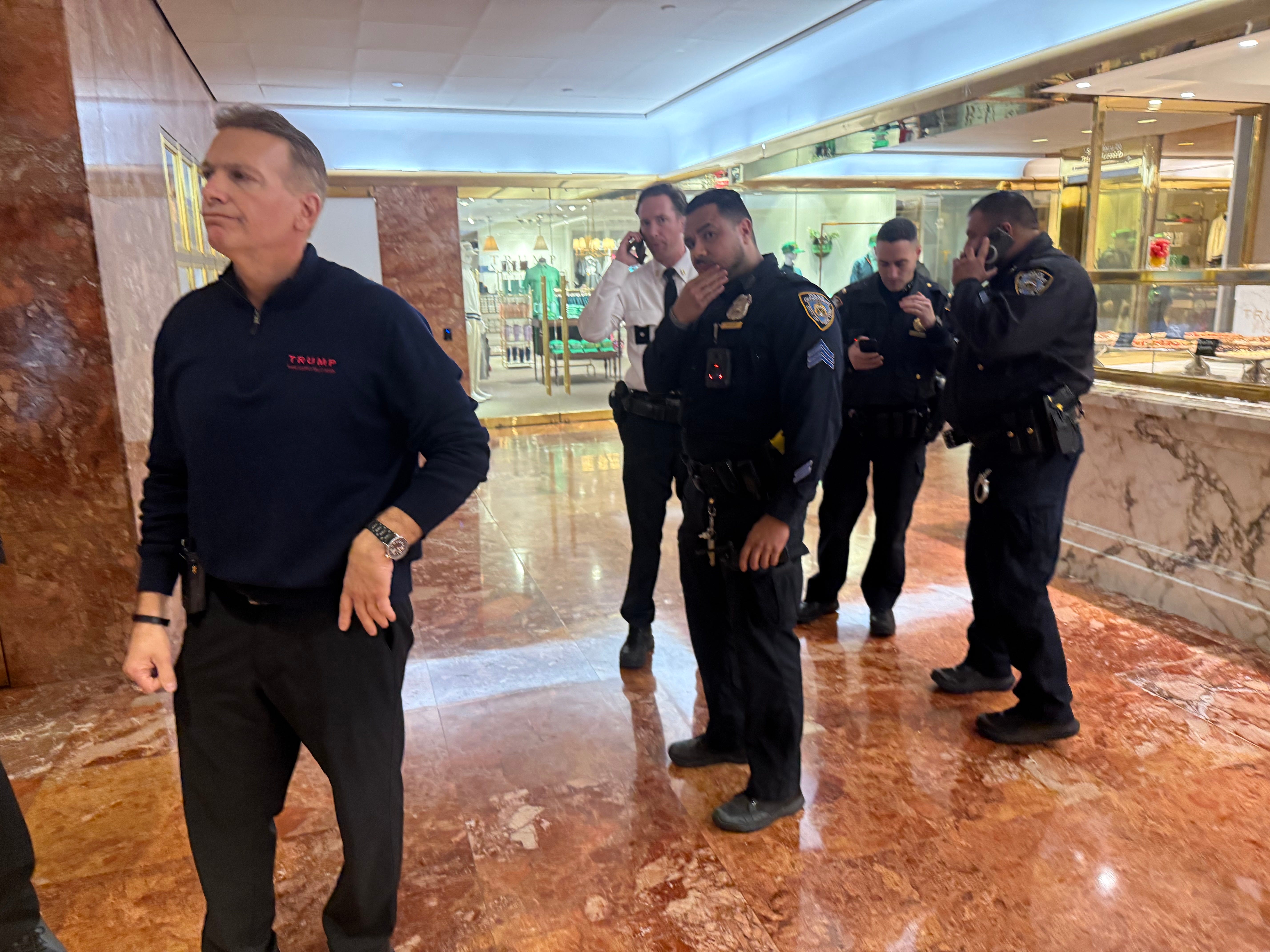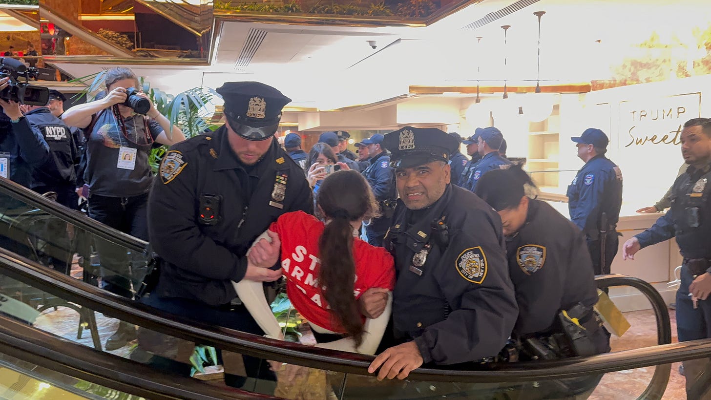 As of 12:15pm, about a dozen NYPD offers are observing the protest. An NYPD officer informed the crowd that if they stay inside Trump Tower they will be arrested for trespassing.