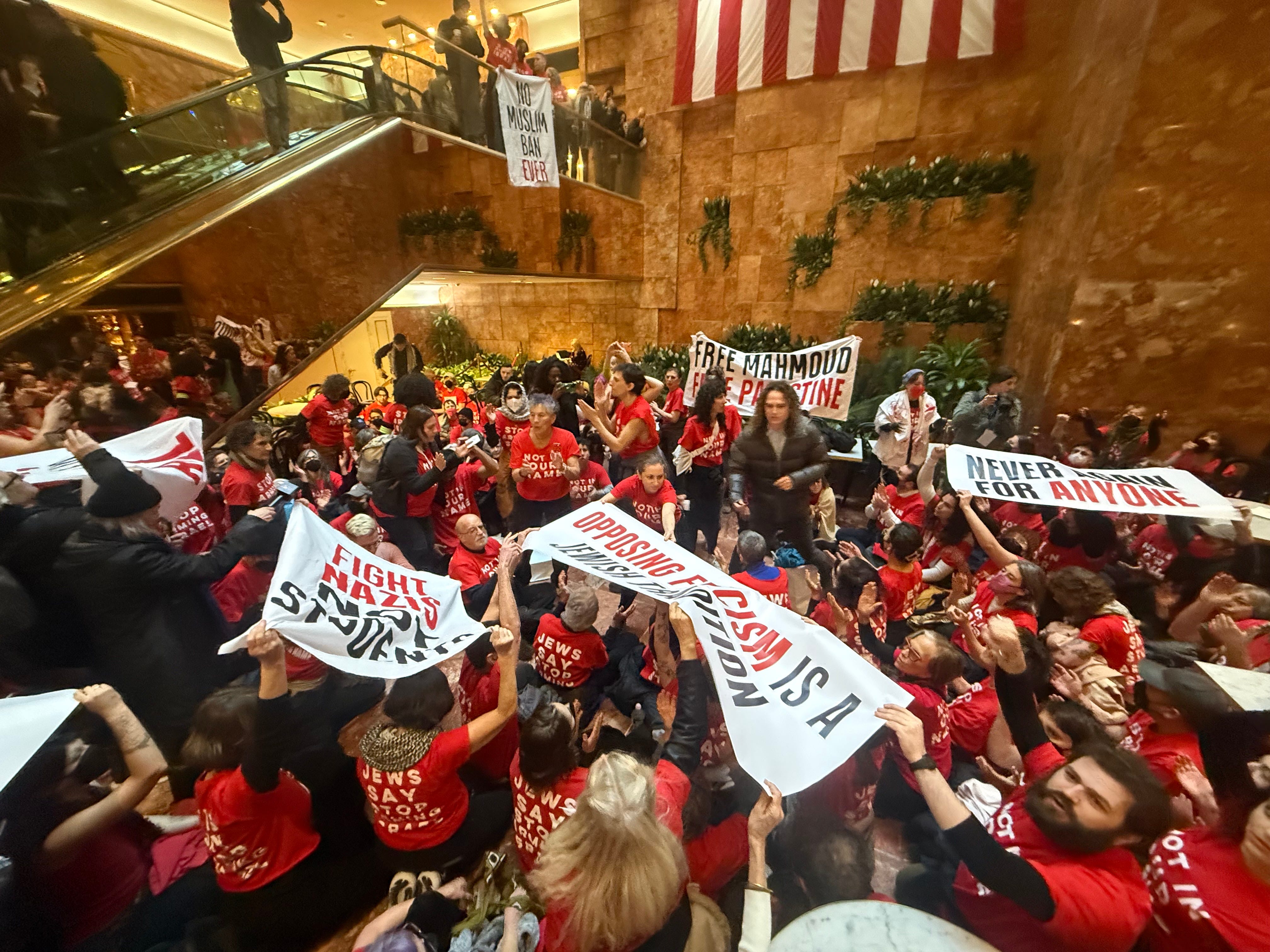 A couple hundred pro Palestine protestors inconspicuously walked into Trump Tower this morning. The protestors gathered downstairs near the “Trump Grill.”