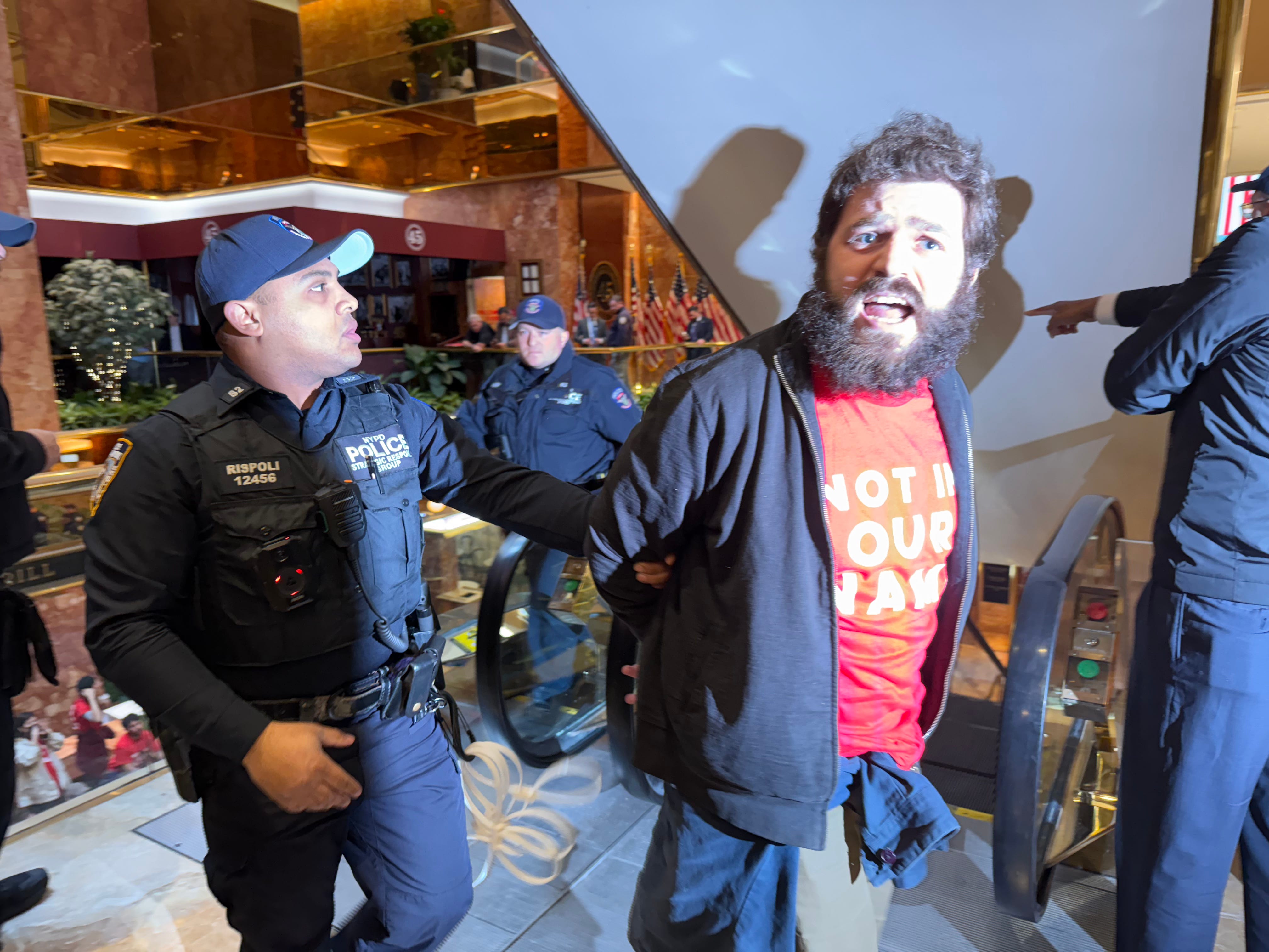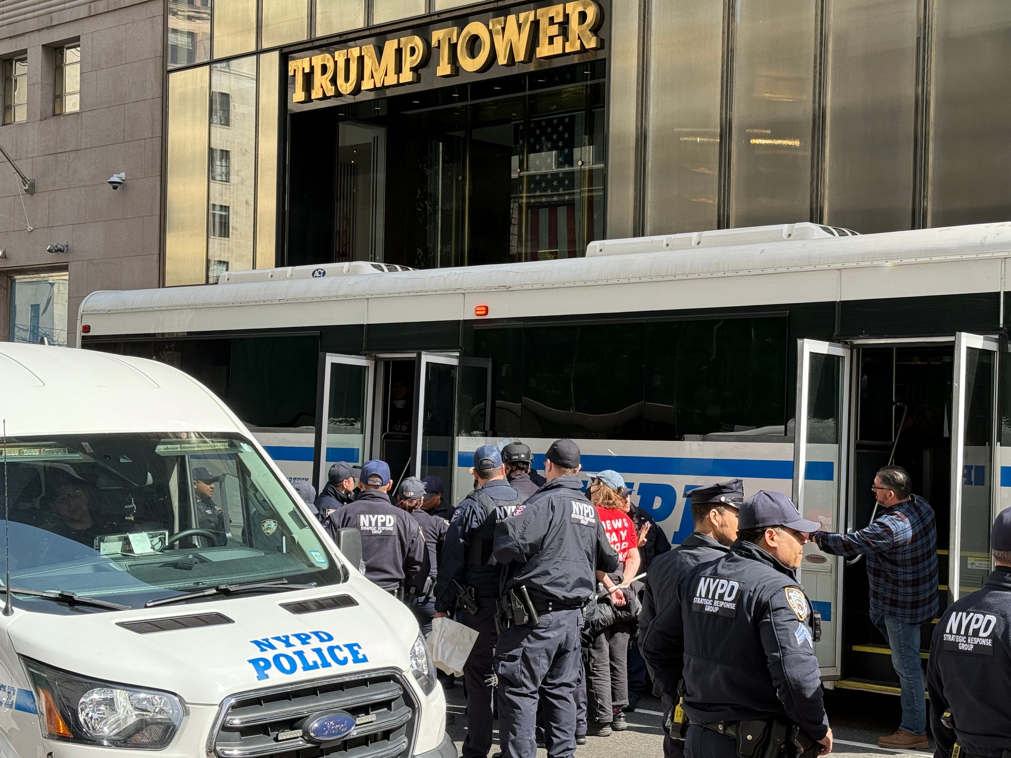 Update 1:47 PM: Police arrested about 100 protestors who remained inside Trump Tower. They were loaded onto an NYPD and MTA bus.