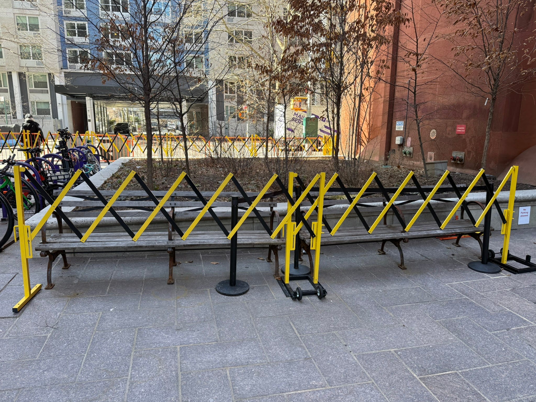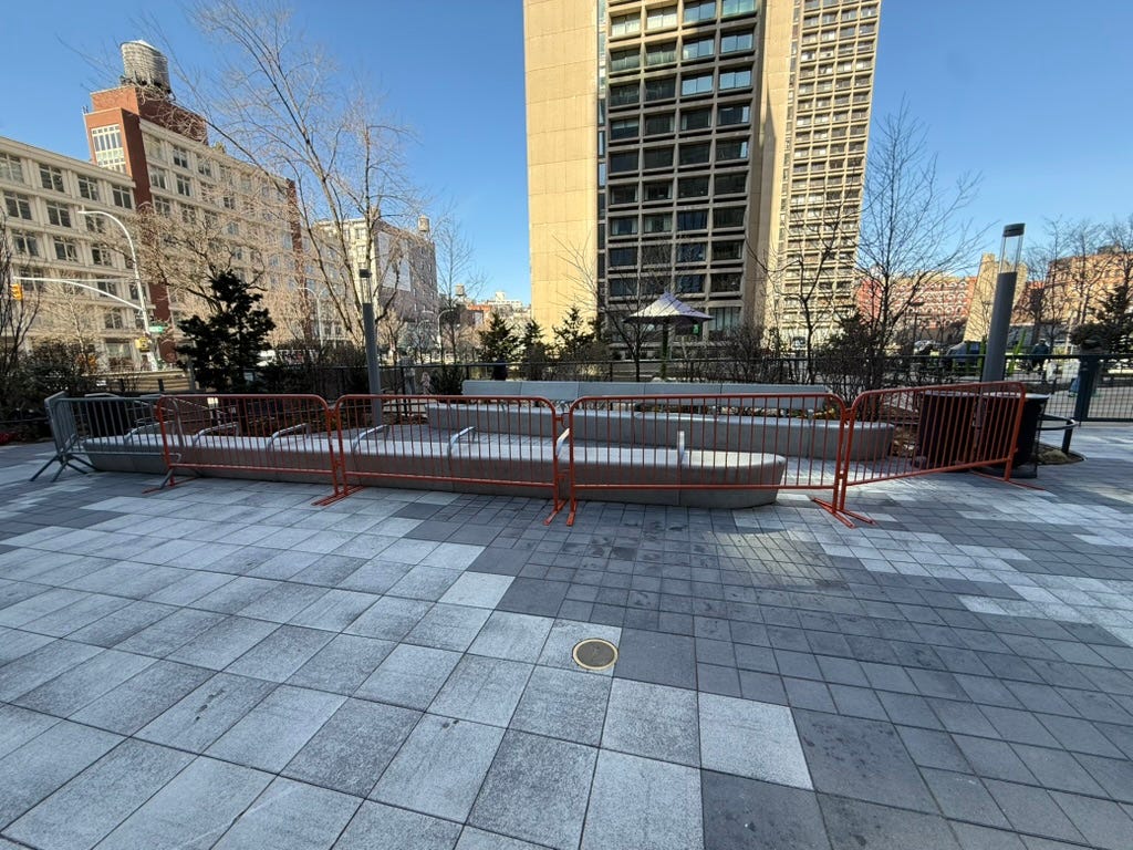 On Tuesday morning, William Turton Blog approached a private security officer about fences surrounding the benches on a pedestrian walkway. The benches, placed between a playground and a $1.2 billion New York University building in Manhattan, were cordoned off as if there was nuclear waste emanating from the seats.